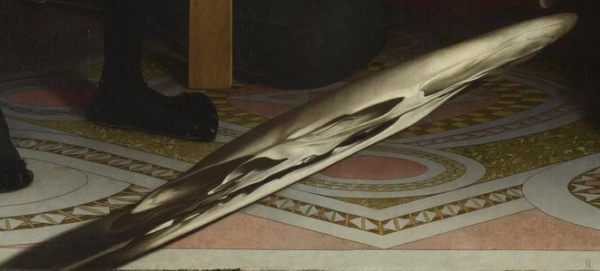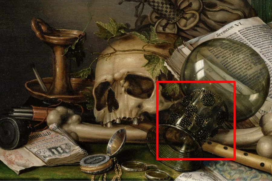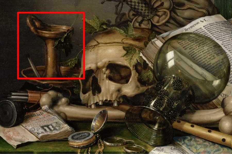 Ещё один интересный художественный приём, приписываемый интерпретаторами жанру Vanitas — «обманка». Взглянув в первый раз на эту картину, можно не заметить ничего примечательного, но если присмотреться, то снизу возможно обнаружить парящий в воздухе инородний предмет, по моему мнению, не вписывающийся в эту картину. Он моментально выбивается из общего изображения и создаёт эффект неправдоподобности. Подобны визуальный приём моментально создаёт много загадок и привлекает к себе внимание. Но в зависимости от угла зрения, оно будет меняться и приобретать форму черепа, такой приём называется «анаморфозой». Символика черепа ясна, как и везде он имеет олицетворение бытия и тщетности жизни, но тут является некой метафорой и скрыт под уверенностью людей, считающих, что смерть их не коснётся. Также в картине имеются и религиозные мотивы, к примеру распятие слева в верхнем углу, именно это напоминает зрителю, что бог — видит всё.