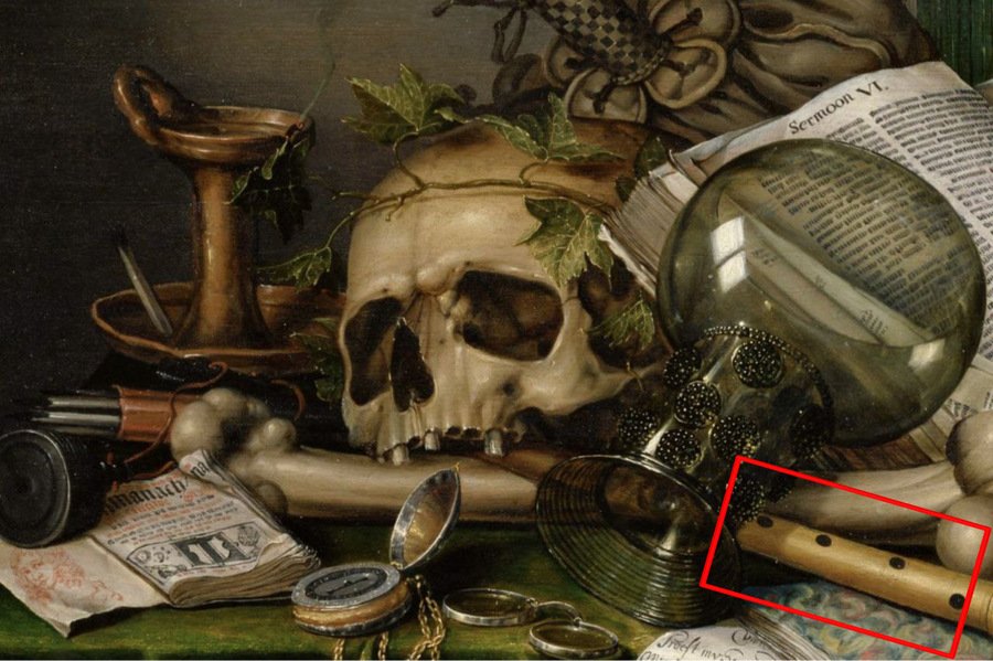 -Флейта практически во всех натюрмортах символизирует мимолетность и удовольствие, что обычно заставляет людей «искушаться».