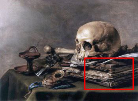 Во второй работе Класа дела с художественным и приёмами обстоят иным образом. В целом композиция тяготеет к реалистическому изображению — форма черепа хорошо прорисована, переданы нюансы объёма, блики на костной поверхности, текстура корки книг и ткани стола. Художник жертвует микроскопической анатомической точностью ради общего впечатления и символической ясности. Череп показан трёх‑четвертным ракурсом с небольшого возвышения — мы видим и лобную, и боковую части, и часть нижней челюсти. Такой ракурс создаёт ощущение присутствия и объёма, даёт возможность прочитать глубину орбит и полость рта. Доминирует направленный, верхне‑левый источник света. Он формирует чёткую светотеневую модель (сильные блики на выступающих участках и глубокие тени в полостях), что подчёркивает форму и придаёт драматизм. Видны скулы, орбитальные впадины, носовой остаток, зубы различимы по форме и положению. Это говорит о переходе от условного «символического» черепа к точному наблюдению реальной формы. Контраст текстур (гладкость кости — шероховатость бумаги — блеск металла — мягкость ткани) усиливает тактильность и реализм, а также подчёркивает контраст между бренным и созданным человеком (знание, искусство, роскошь). Пустое пространство вокруг предметов и глубокие тени создают ощущение уединённости, меланхолии и отрешённости — типичные эмоции ванитаса.