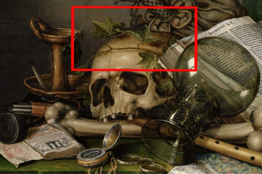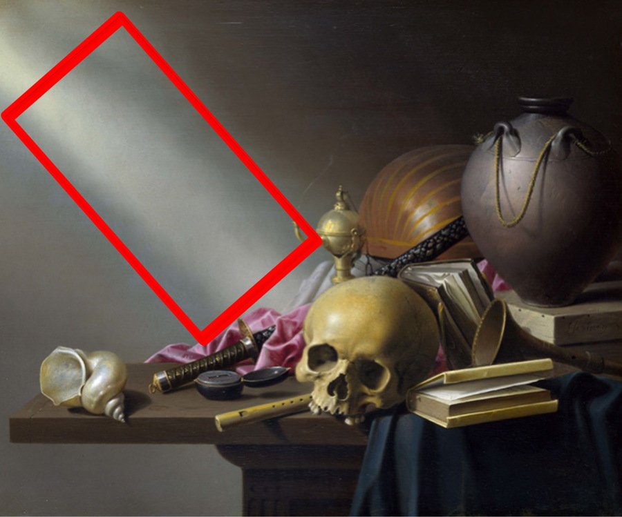 — Затем перейти к взаимодействию черепа с другими символами Vanitas (часы, увядшие цветы, книги, музыкальные инструменты) и завершить анализом общей композиции.