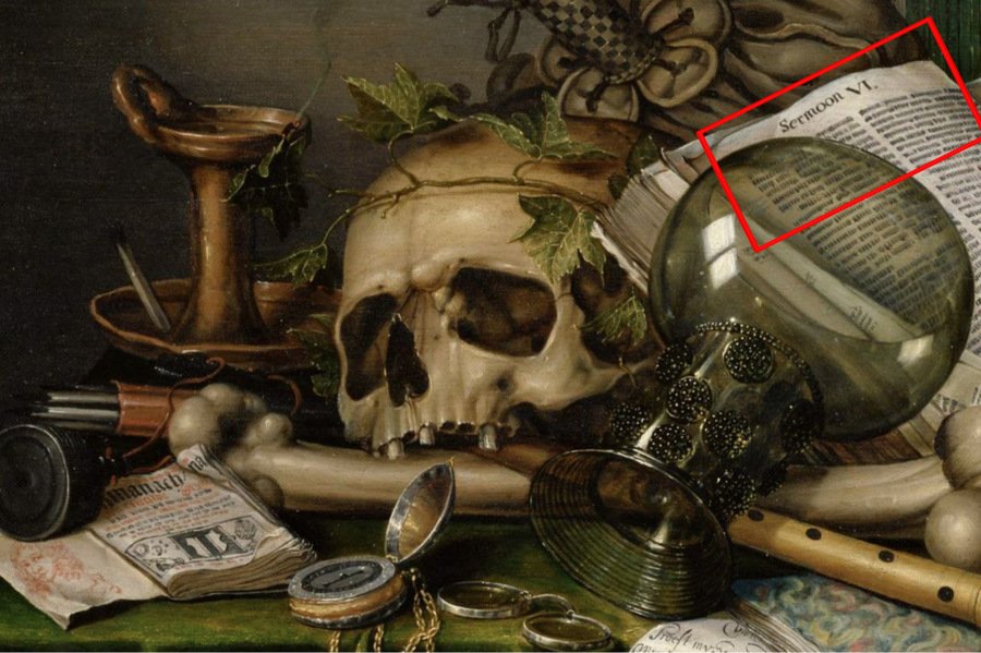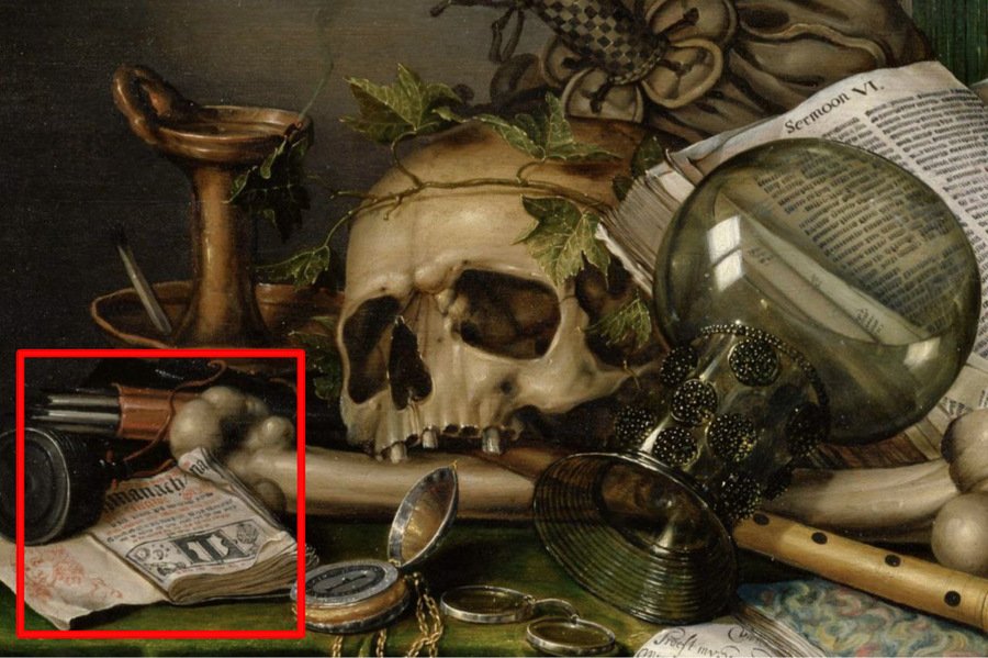 - Книги и манускрипты («Sermoon VI», «Almanach»), символы человеческого знания, приведённая письменности может указывать на людское стремление понять мир и «взять» под власть время. В контексте жанра Vanitas это может напоминать, что даже самые глубокие знания никак не спасут от смерти.