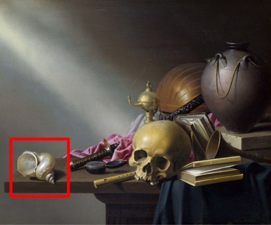 -Самый яркий и привлекающий на себя внимание символ — морская раковина, в жанре Vanitas зачастую она может олицетворять похоть, экзотику и богатство или же быстротечность жизни, так как когда-то она была домом для живого существа, а теперь пуста.