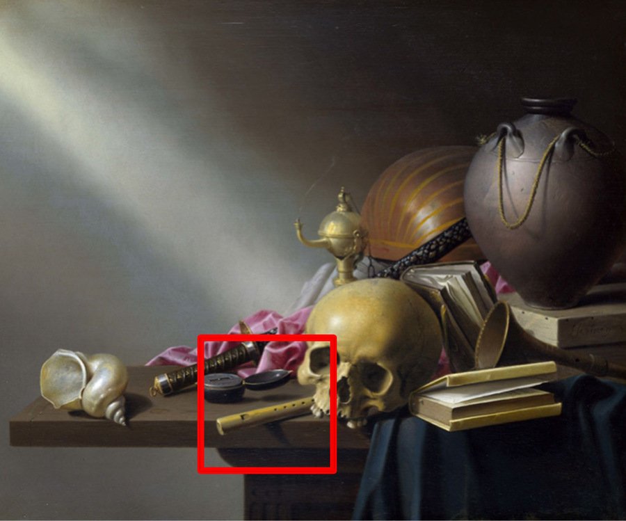 - Японский меч или Восточный кинжал, изысканное оружие, возможно указывающий на голландские торговые связи с Востоком. А в целом меч — это символ власти, чести и войны. Он говорит о способности человека разбивать и разрушать, а красно-розовая ткань, лежащая рядом, может символзировать кровь и страсть, всё это подчиняется смерти.