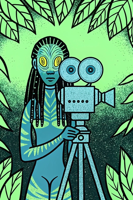 Prompt: a Na’vi from Pandora holds a retro cinema projector, their golden eyes studying the viewer. Bioluminescent patterns glow softly on their blue skin, contrasting with the jungle backdrop and the sleek camera, as if poised to capture the viewer’s story.