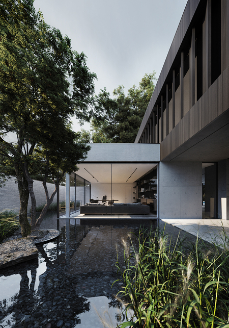 The architectural image is formed by two volumes, light and dark one, almost like Yin and Yang, symbolizing the duality of everything mundane. From the side of the roadway, the facade is made with minimal glazing, and the side surfaces completely exclude visibility from the neighboring plots. The facade facing the inner garden, on the contrary, has distinguishing panoramic glazing.