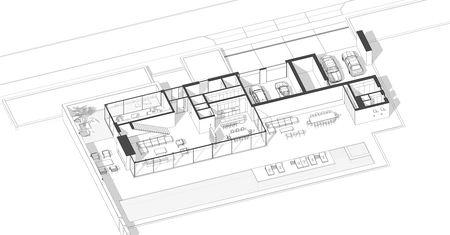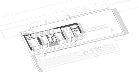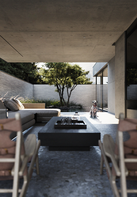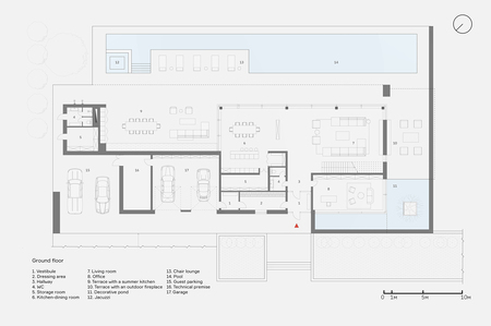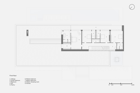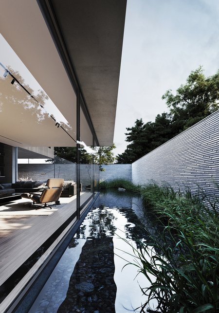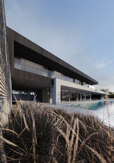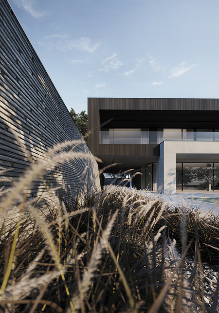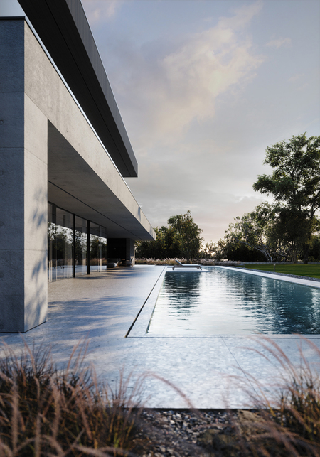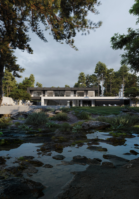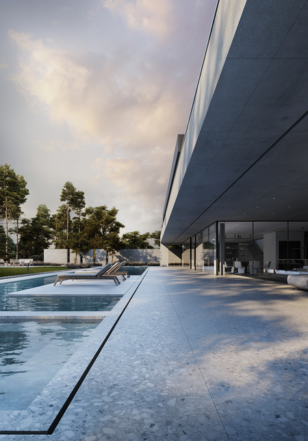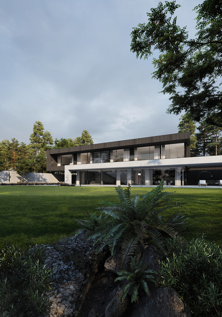 The site is located in the Repino resort area of St. Petersburg. Two-storey house with a total area of 825 m² is positioned on a picturesque lot of 0.2 hectares with a minimum slope. The architectural style is minimalistic, yet not ascetic. The concept is based on laconic forms, strict silhouette and clear zoning. The project was inspired by the work of Ludwig Mies van der Rohe, a leading figure of modernist architect generation of the 20th century. At the heart of his «less is more» philosophy lies the clarity and comprehensibility of the design. Architectural simplicity is expressed in the ephemerality of the structure, free planning and homogeneity of façade materials.