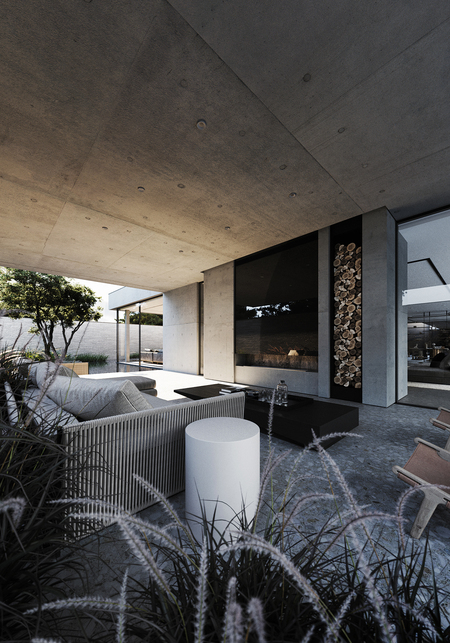 On the lower level there are coomon premises — a large living room and a kitchen-dining room, as well as a spacious office with a meeting area. The living room on one side is connected to an outdoor pool and a lounge area with a kitchen, and on the other it faces a private terrace with a real fireplace overlooking the inner garden. At the same time, the office is isolated from the common area, with a peaceful view of the garden. On the second floor there is a master block, 2 children’s bedrooms and guest rooms. Each bedroom has access to a terrace. The landscape design of the local area is not overloaded with details, geoplastics and complex structures: open lawn was left in front of the house for picnics, walks and sports events.