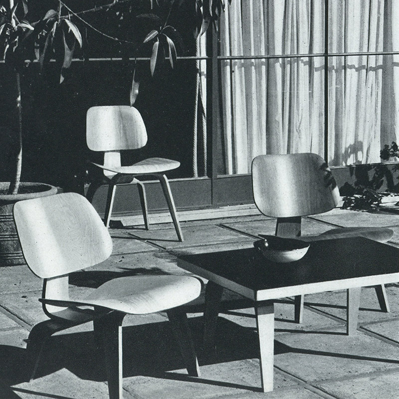 Ключевой пример — кресло LCW (Lounge Chair Wood), созданное Чарльзом и Рэй Имзами в 1945 году. Это кресло было результатом многолетних экспериментов с фанерой: сначала для медицинских шин в армии, потом — для мебельного формообразования. Они обнаружили, что многослойная фанера может быть не просто податливой к изгибу, но и упругой, если сгибать её одновременно в двух направлениях. В LCW спинка и сиденье — независимые части, мягко соединённые «позвоночником» из резиновых соединений. Дерево в этом объекте словно заново открывает собой тело: оно дышит, пружинит, поддерживает, согревает.