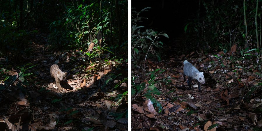 Проект Unseen Rainforest, реализованный в национальном парке Нуабале-Ндоки, демонстрирует, как фотоловушки могут запечатлеть ранее недоступные аспекты жизни дикой природы. Фотограф Уилл Беррард-Лукас разместил камеры у подножия деревьев [7, 8]. Этот метод позволил получить изображения дымчатого леопарда и других редких видов в уникальном ракурсе — на уровне их естественной среды обитания. Снимки раскрывают поведенческие закономерности, которые оставались невидимыми для ученых и фотографов на земле. В проекте фотоловушки становятся буквально «глазами» самой экосистемы, документируя ее жизнь изнутри, без искажающего влияния присутствия человека.