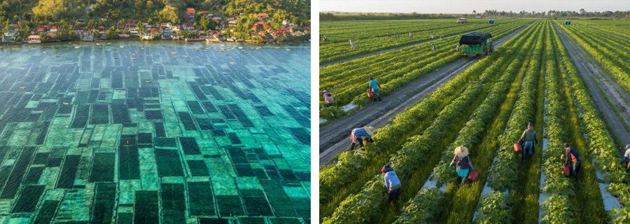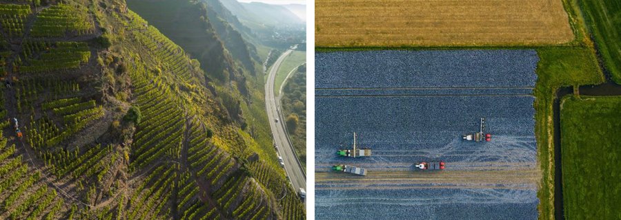 Современный фотограф Джордж Стейнметц в проекте «Feed the Planet» использует дроны для документирования глобальной продовольственной системы [12]. Его снимки сельскохозяйственных угодий, животноводческих ферм и рыбных хозяйств демонстрируют индустриальные масштабы производства пищи. Высота съемки позволяет охватить гигантские территории, показывая, как человек преобразует планету для своих нужд. Стейнметц часто выбирает перпендикулярный ракурс, который превращает сложные процессы в геометрические абстракции — сбор урожая создает видимость таблиц и других прямогульников, а системы содержания животных напоминают микросхемы. Этот технический прием подчеркивает системный характер современного сельского хозяйства, где природа подчинена строгой логике эффективности. Фотограф сознательно избегает демонстрации отдельных людей, акцентируя внимание на масштабах антропогенного воздействия. Этот взгляд выявляет как красоту геометрических паттернов полей, так и тревожные последствия интенсивного землепользования, предлагая беспристрастную документацию наших взаимоотношений с природой, где эстетическое наслаждение соседствует с экологической рефлексией.
