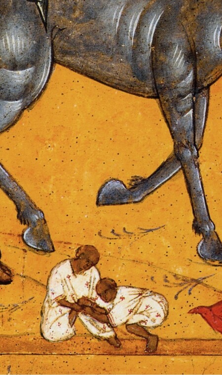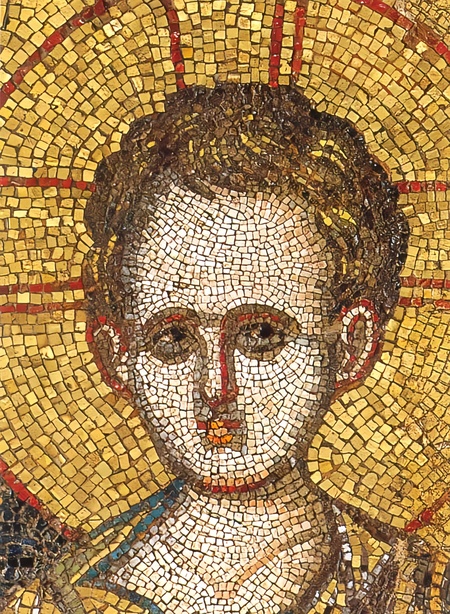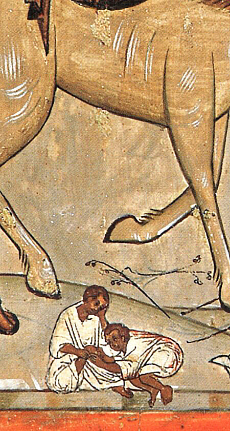 Если приглядеться, в нижней части иконы можно заметить двух маленьких мальчиков; их совершенно не интересует происходящее вокруг. Один из них сидит в позе скорби, подняв ногу, а второй разглядывает его ступню. Становится ясно, что это сцена вынимания занозы. Она практически аналогична эллинистическому источнику.