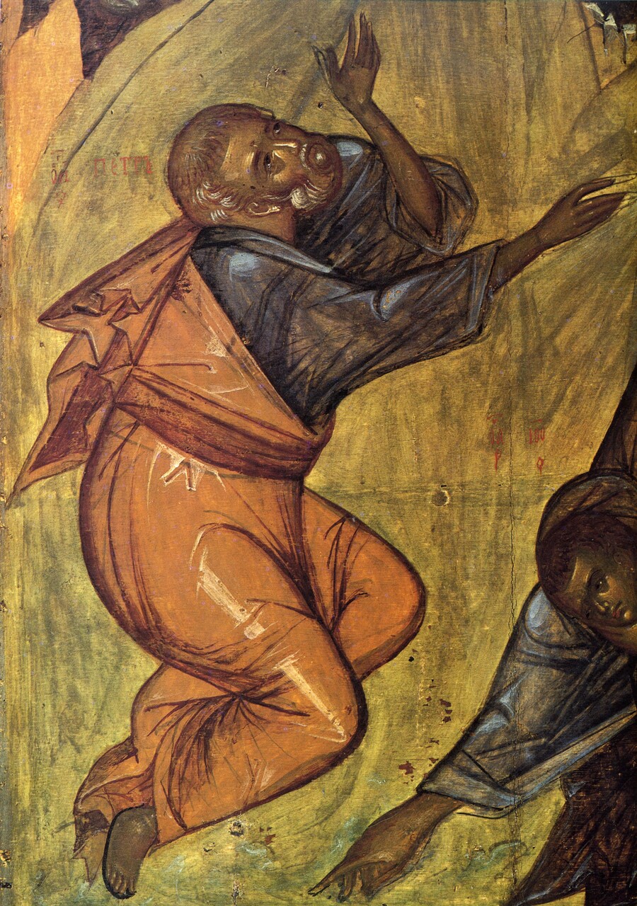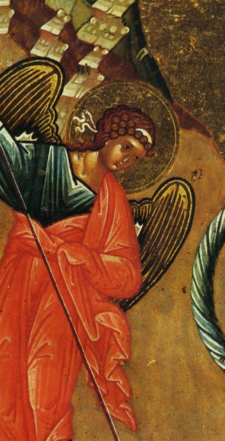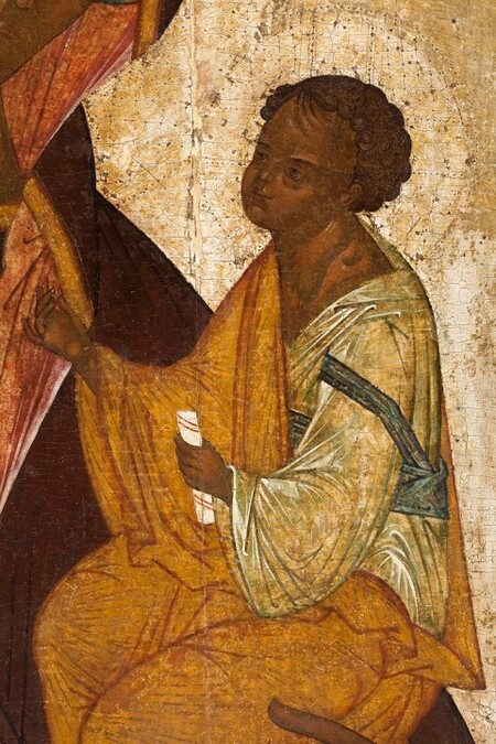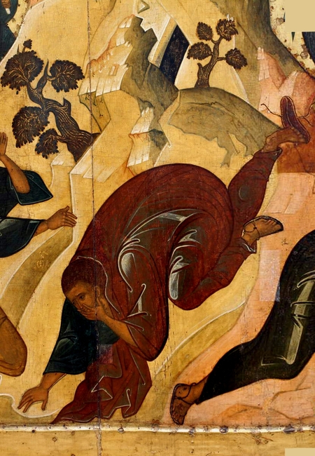 Здесь видно, что на иконе появляется маленькая, не совсем заметная деталь: апостол Иоанн падает и теряет сандалию. Я предполагаю, что данным композиционным решением мастер хотел изобразить динамику движения.