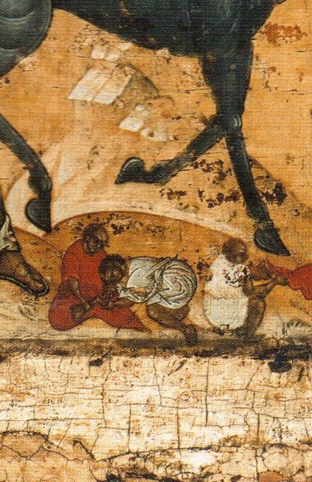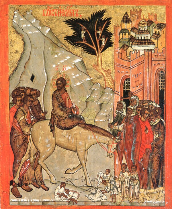 На русских иконах люди кладут под ноги лошади зеленые ветки или вербу (аналог пальмовых ветвей), а дети постилают одежды.