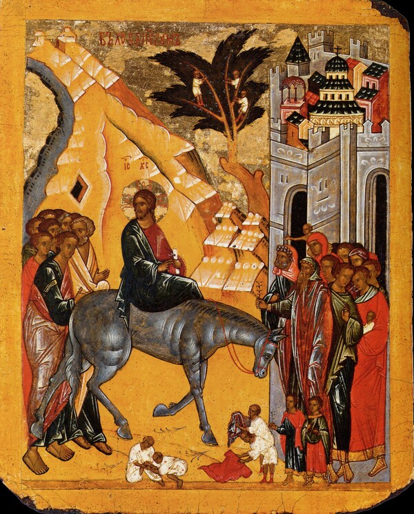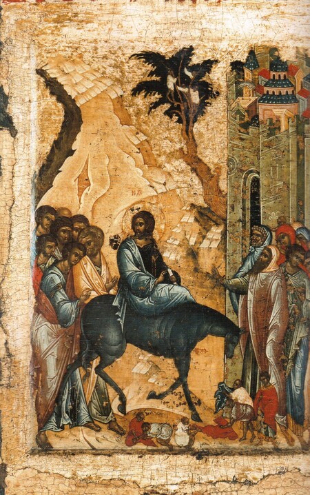Рассмотрим иконы с сюжетом Входа Господня в Иерусалим. Помимо самого Христа на ослике (в случае русских икон — на лошади) и апостолов, идущих позади, изображали встречающих его горожан.