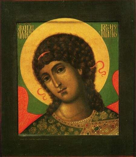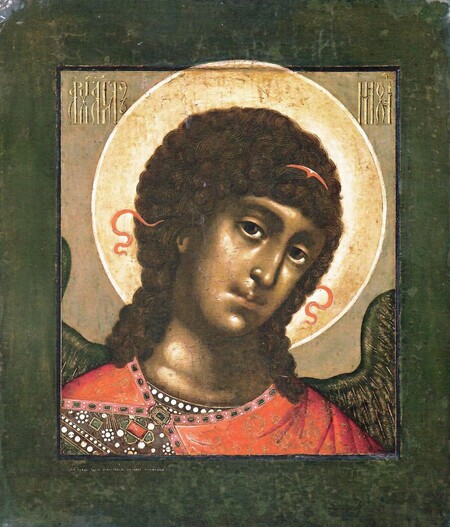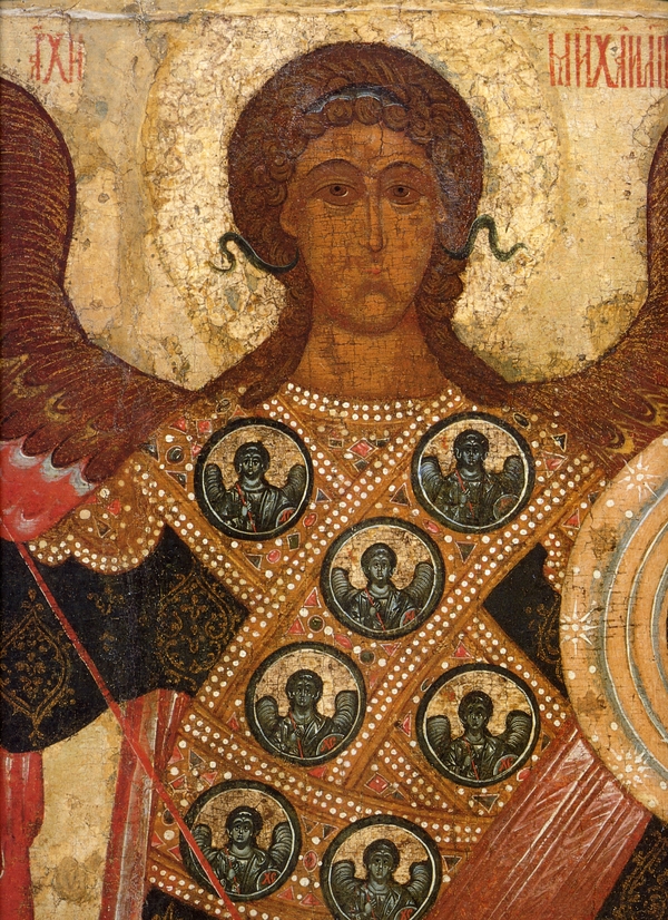 На русских иконах и фресках прическу ангелов часто дополняют две ленты: они развиваются либо сзади, либо справа и слева от головы. Приглядевшись, нетрудно заметить, что это единая лента, продетая сквозь волосы, — она проходит над лбом и спускается по сторонам. Такую перевязь для волос, охватывающую голову, часто украшенную драгоценными камнями, носили римские императоры. Она была вплетена в прическу богини Ники, которая стала прообразом ангелов в христианском искусстве. [1]