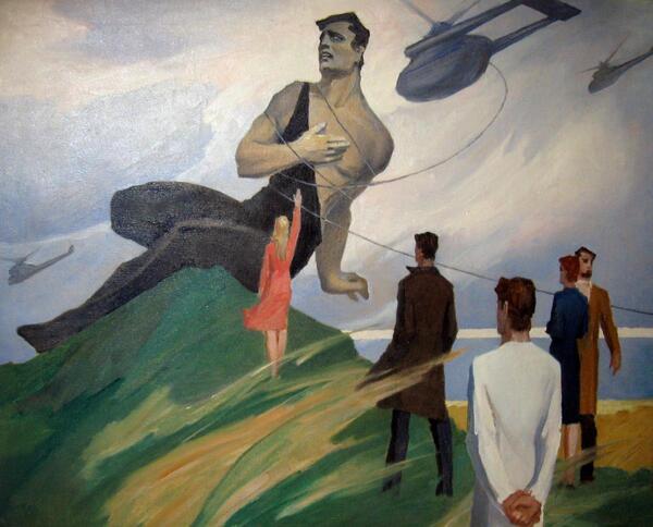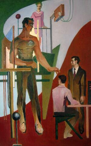 Картина «НИИ генетики» (1970-е) запечатлела фантастический момент: учёные в лаборатории через окно наблюдают живого мамонта на снегу, видимо, воскрешённого благодаря генетическим экспериментам. Эта работа показывает популярную для жанра идею клонирования вымерших существ.