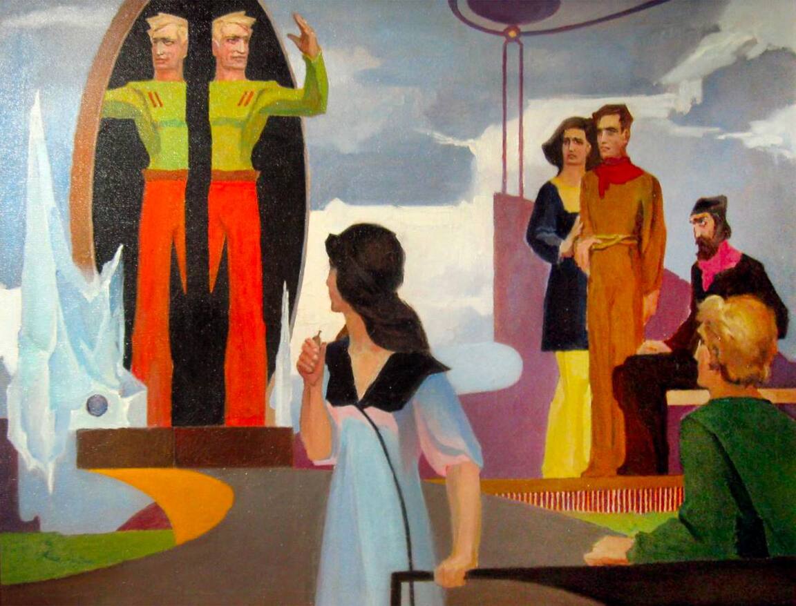 Особого внимания заслуживает деталь, которая проходит сквозь несколько работ Голобокова — белые волосы у молодых людей будущего. В его картинах этот элемент становится частью визуального кода «инопланетности» или «преображённого человека». Сегодня белые или платиновые волосы — модный тренд, не вызывающий удивления, но в контексте 1960-х 70-х годов такой образ воспринимался как отклонение от нормы, как знак принадлежности к будущему, очищенному от прошлого. Белые волосы в этом случае символизируют чистоту, нейтральность, возможно — высокоразвитое сознание, и воспринимаются не как возрастной признак, а как эстетика новой эпохи. Это можно сопоставить с образом героини Нийи в фильме «Через тернии к звёздам», чья короткая белая стрижка сразу сигнализирует зрителю: перед ним — не землянка, а существо другого мира.