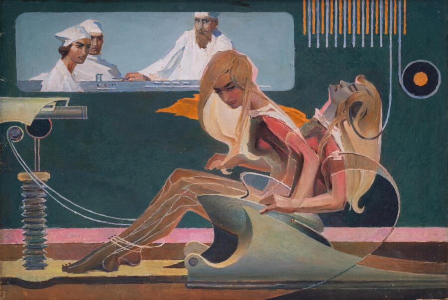 В картине «Регенерация» Голобоков изображает фантастический медицинский процесс, где человек будто заново обретает здоровье благодаря передовым технологиям. Вероятно, мы видим восстановление человеческого тела в капсуле после серьёзного повреждения: ткань регенерирует, функции организма возвращаются, а сама установка работает как высокотехнологичный аналог будущей медицины. Это образ исцеления, основанный не на чуде, а на научном подходе, опередившем своё время.