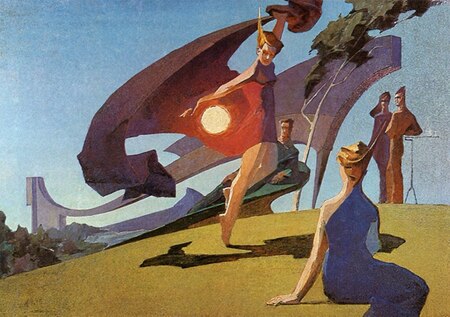 На картине «Четвёртое измерение» изображена загадочная фигура с семиступенчатой лестницей в руке, символизирующая выход за пределы привычных трёх измерений. Художник пытался визуально передать идею 4-го измерения — будь то время или иное пространство, непостижимое обычному человеку. В кинематографе один из наиболее ярких примеров воплощения четвёртого измерения — финальная часть «Интерстеллара» (2014). Главный герой, оказавшись внутри чёрной дыры, попадает в сюрреалистичную тессеракт-комнату — трёхмерную проекцию 4-го измерения (времени). Вокруг него бесконечно повторяется книжный шкаф, через который он может взаимодействовать с прошлым. Эта сцена прямо иллюстрирует попытку человека существовать в четырёхмерном пространстве: для Купера время перестаёт быть линейным, он видит сразу множество моментов жизни, протянувшихся перед ним в виде бесконечной решётки книг.