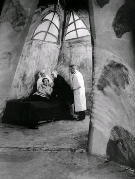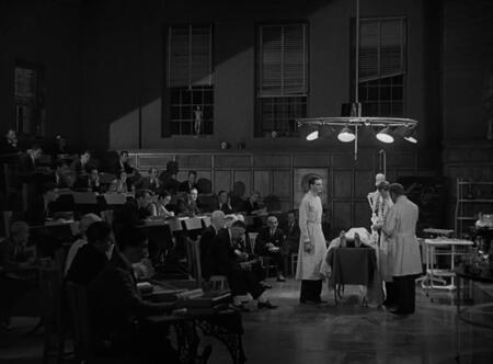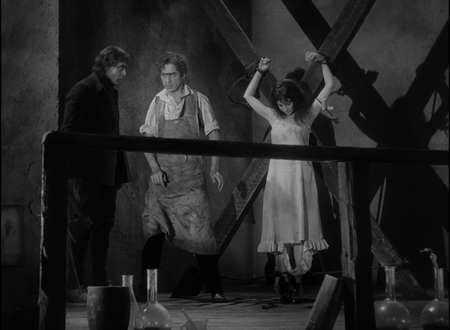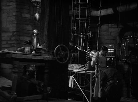 В «Франкенштейне» Джеймса Уэйла театральная мизансцена сохраняется в лабораторных эпизодах, где Виктор Франкенштейн и его помощник создают монстра. Фронтальность и симметрия композиции делают каждую деталь интерьера значимой: электрические приборы, столы, колбы — всё работает на создание напряжения. Однако камера уже начинает двигаться: скользящие планы, постепенное приближение к лицам, наклонные ракурсы и игра перспективой создают ощущение, что зритель «проникает» в пространство, которое раньше было исключительно сценическим.