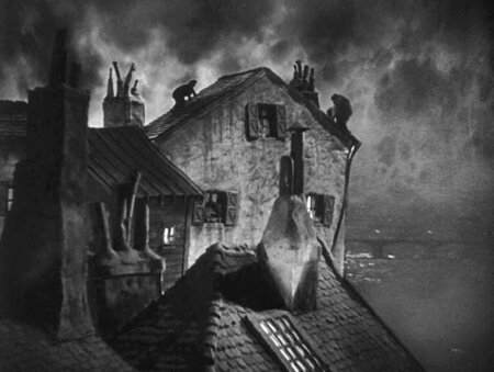 В более общих городских видах страх производится другим приёмом: резкие вертикали, острые контуры крыш, стремящиеся вверх линии чердаков и труб образуют враждебный, угрожающий силуэт. Архитектура словно утрачивает свою функциональность и превращается в оживлённую, пульсирующую субстанцию. Улица — не место действия, а самостоятельный актант, дышащий и наблюдающий. Тёмные проёмы окон, зубчатые крыши, контрастные тени создают образ города-хищника, напоминающего монстра с шипами и острыми зубами.