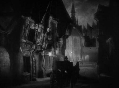 В фильме «Убийство на улице Морг» особенно выразительно работают крупные экстерьерные планы, формирующие ощущение тревоги и визуальной ловушки. Узкие, извилистые улочки выступают не просто фоном, но активным инструментом создания клаустрофобии: пространство словно сжимается вокруг зрителя, заставляя воспринимать город как враждебную среду. Наклонённые стены домов, снятые под острыми ракурсами, напоминают об экспрессионистских декорациях — кажется, ещё чуть-чуть, и они рухнут, нависнув над нами тяжёлой массой.