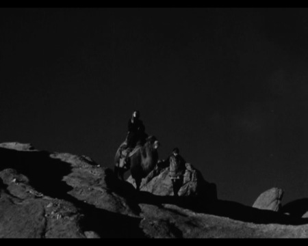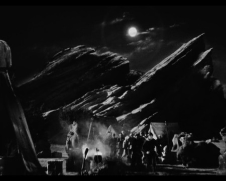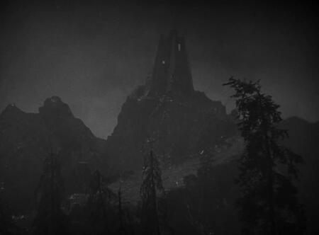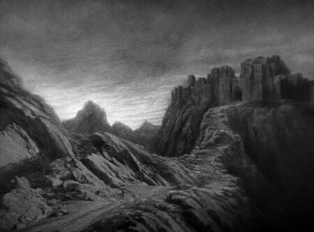 В этом же фильме мы встречаем пугающие и одновременно завораживающие пейзажные сцены, в которых экспрессионистская графичность обретает монументальный размах. Пространство превращается в автономную силу: резкие скальные массивы, словно прорезанные ножом, образуют агрессивный силуэт, вторгающийся в видеоряд. Их ломаные линии формируют ощущение опасности, будто сама земля стремится сжаться и поглотить людей, оказавшихся в этом мрачном и безлюдном ландшафте.