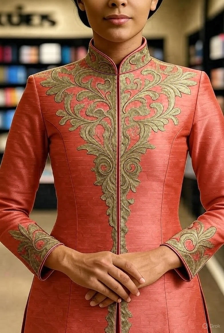 Промт: сгенерируй форму для девушĸи ĸонсультанта в магазине индийсĸой ĸосметиĸи. цвет ĸоралловый, на форме различные золотые узоры
