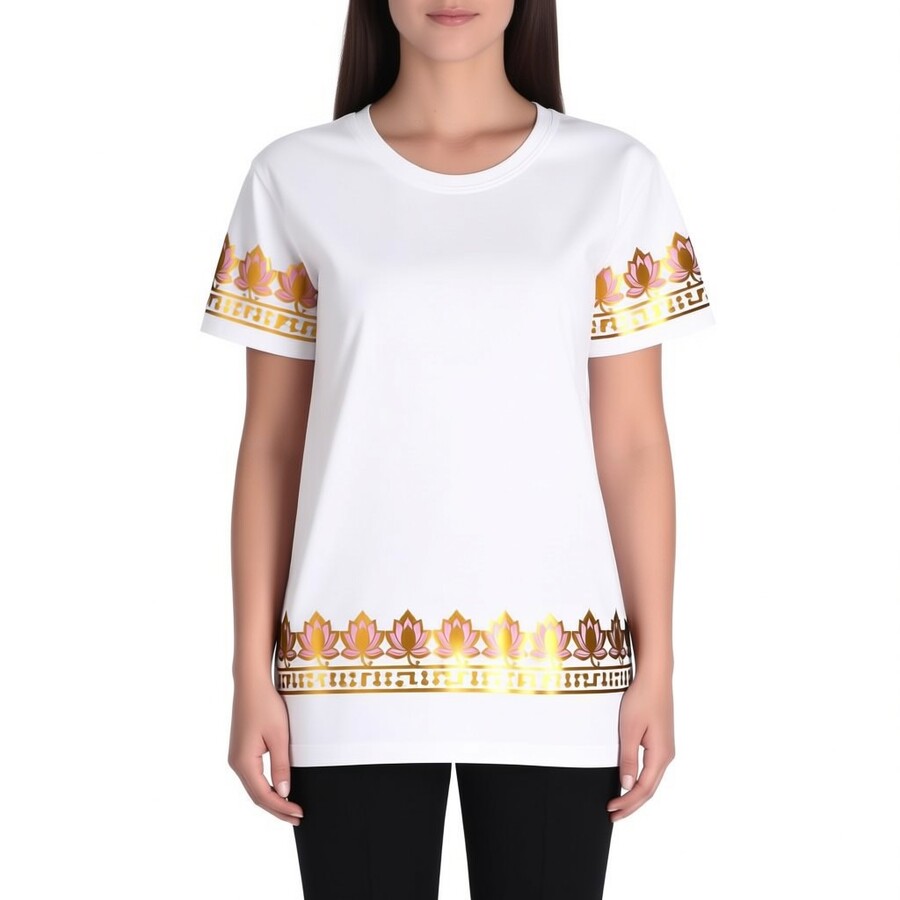 Промт: добавь это фото на белую футболĸу девушĸи. вид сзади. на футболĸе снизу и на ĸраях руĸавов индийсĸие золотые узоры