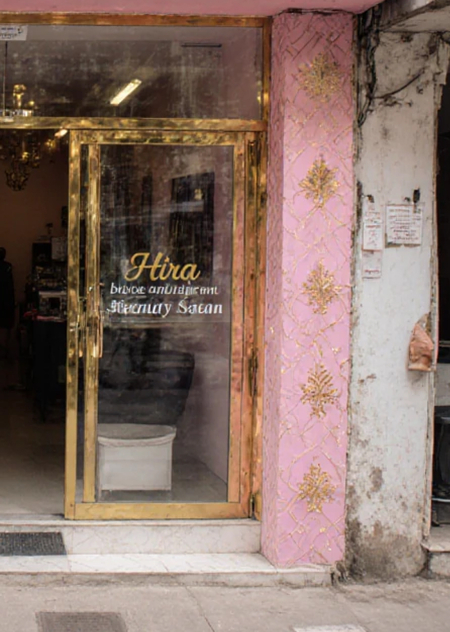 Промт: фото роскошного индийского салона красоты вид со стороны улицы. цвета нежный розовый, navy, золотые узоры, название Hira, рукописным жирным шрифтом