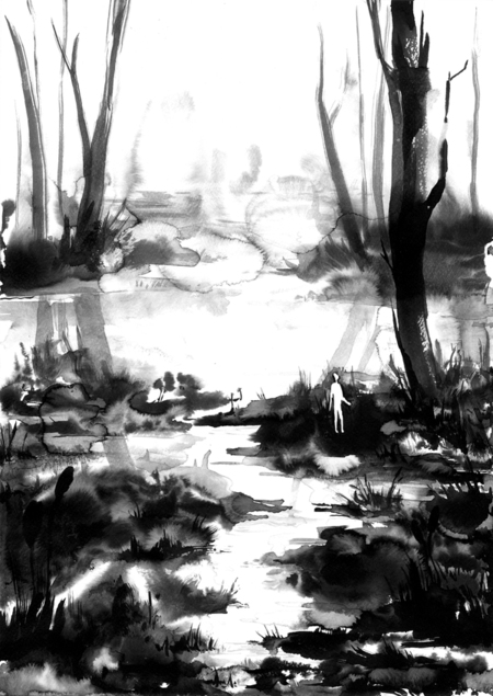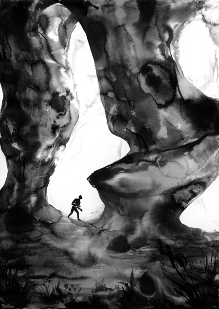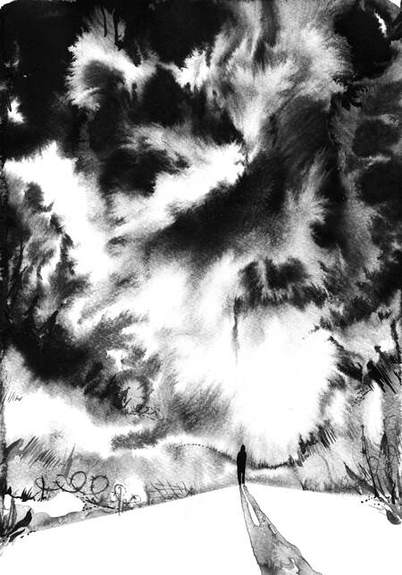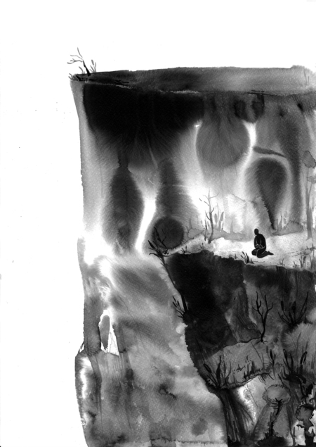 «Сижу, уставившись на эти пятна туши, а в голове — хаос на хаосе… Тушь оказалась не просто материалом чёрного цвета, а целой вселенной, в путях которой можно свернуть направо, налево и даже вверх, в низ и по диагонали или же вообще в никуда. И как мне, чёрт возьми, быть в этой вселенной? Куда мне?»
