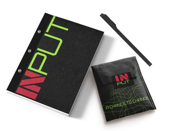 Promt: Create a brand products: notepad, pen, busness card and envelope, for cyberpunk center with logo «INPUT» on the white background. Use bright green, pink and black colors Style: realistic