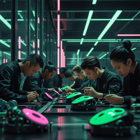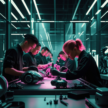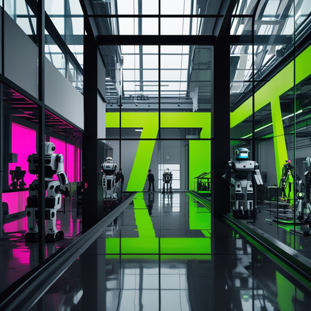 PROMT: Production hall for a cuberpunk center, using glass and metal, where people creates the details for robots. Use black, bright green and bright pink colors.