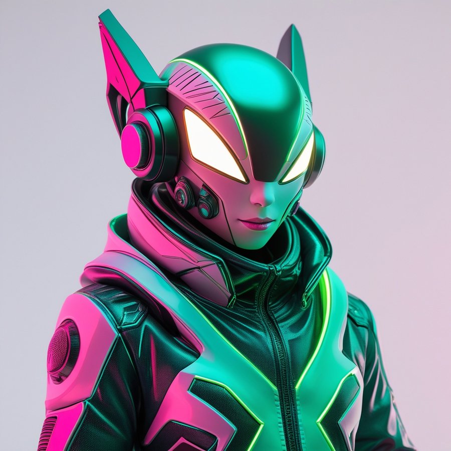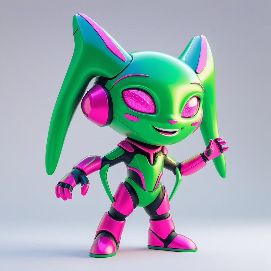 PROMT (Update by ai): A futuristic cyberpunk mascot set against a clean white background, surrounded by vibrant neon accents, with a primary color scheme of bright green and bright pink hues, rendered in a 3D style with sleek, metallic textures and sharp, angular lines, giving off a sense of high-tech energy and rebellious attitude, with bold, glowing accents that evoke a sense of digital innovation and avant-garde style, the mascot’s design blending organic and synthetic elements, with intricate details and patterning that reflect the intersection of humanity and technology.