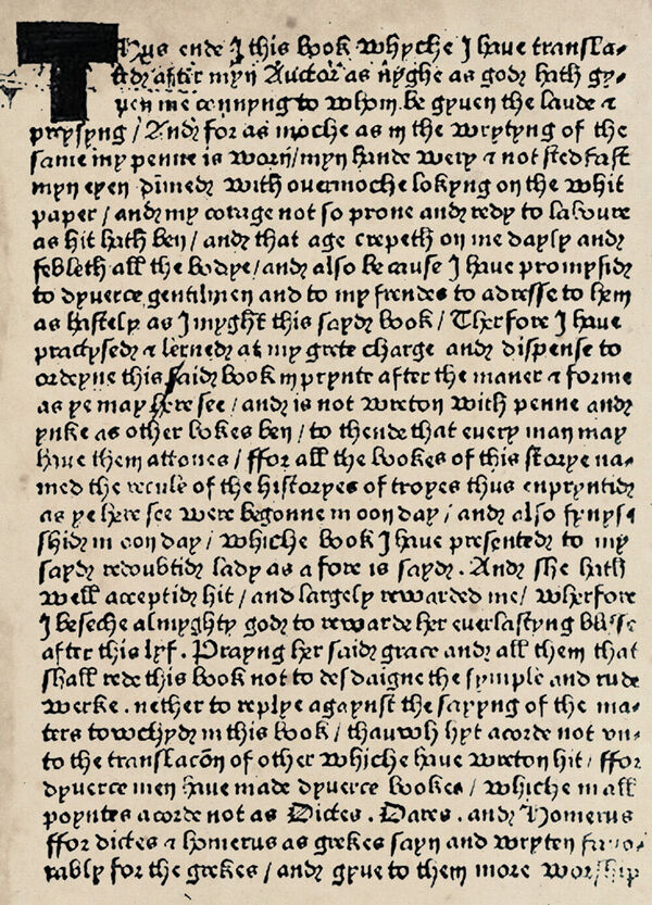 Одним из дошедших до нас объявлений стало сообщение о продаже молитвенника в 1477 году: «Если кому-нибудь из духовных или светских людей будет угодно приобрести книжку, в размер этого объявления, которая хороша и по-настоящему правильна, если он заедет в Вестминстер в богадельню у тростниковой ограды, то получит от них хорошую еду. Пожалуйста, не срывайте это объявление».