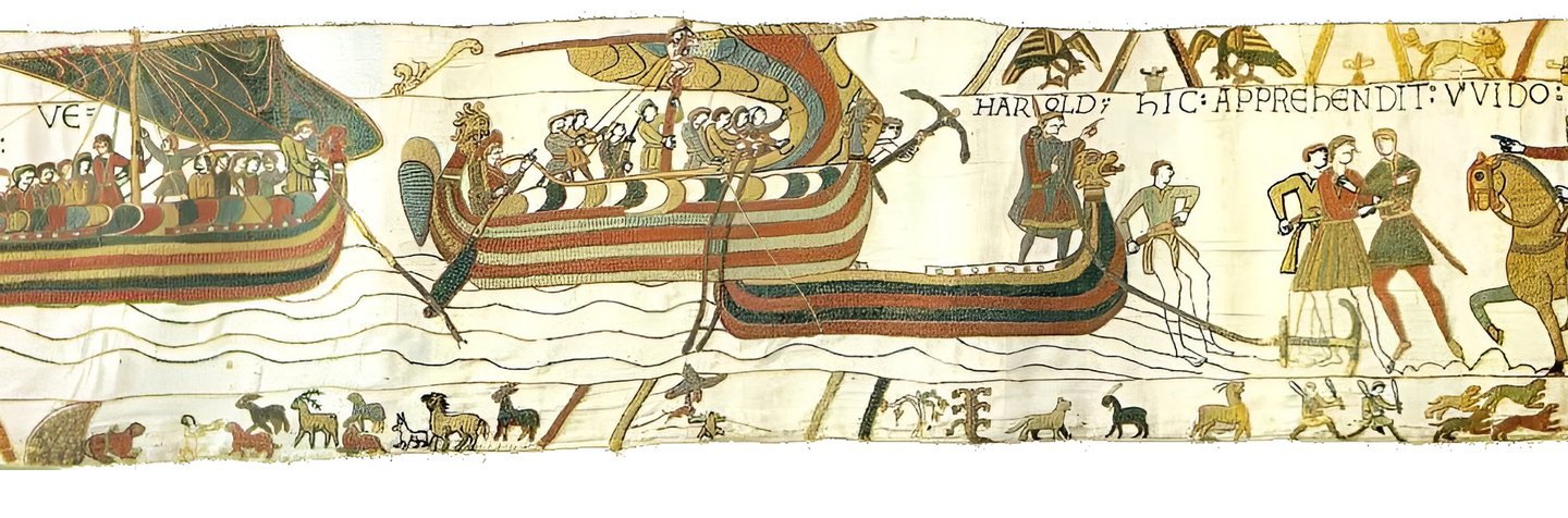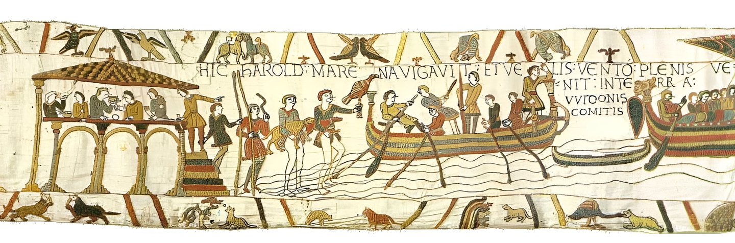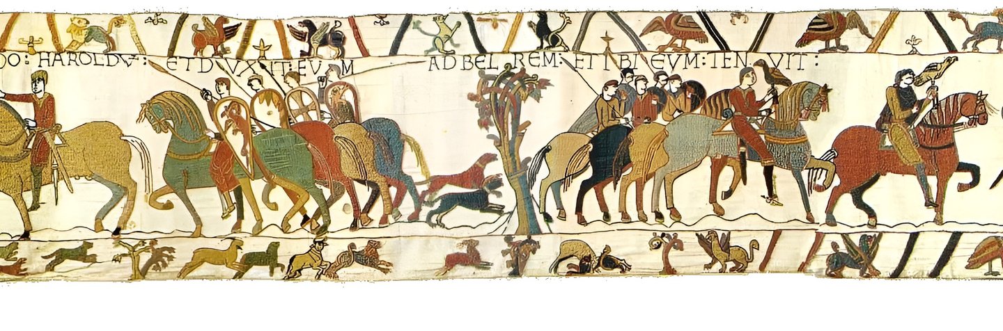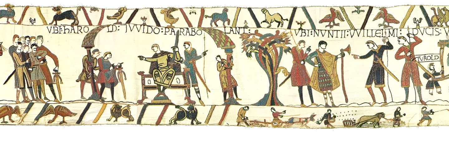 А вышивка гобелена из Байё разворачивает историю нормандского завоевания как протяжённую ленту, где сцены следуют одна за другой. Линейность становится характеристикой не только смысла, но и формы: пространственное продвижение вдоль ткани непосредственно совпадает с продвижением по времени рассказа.