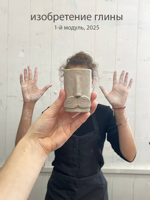 В прошедшем модуле курс «Изобретение глины» впервые проходил в жанре вариатива, занятий было много. Была возможность не только научиться первичным навыкам работы с глиной, но и создать достаточно изделий, чтобы сформировались черты серии предметов и авторской манеры их изготовления. В ситуации перепроизводства вещей на планете, создание новых должно быть оправдано. В нашем случае оправдание—душевная потребность в создании «своей» вещи, единственной в мире, сделанной вручную. В определенный момент времени, и с понятной автору целью, будь то: ностальгия, творческий эксперимент, или поиск гармонии с собой в увлекательном процессе взаимодействия с материалом. Основные техники лепки—работа с комом и пластом. Роспись—цветные ангобы, окончательное покрытие—прозрачная глазурь. Материал—каменная высокотемпературная глина.