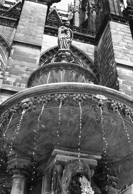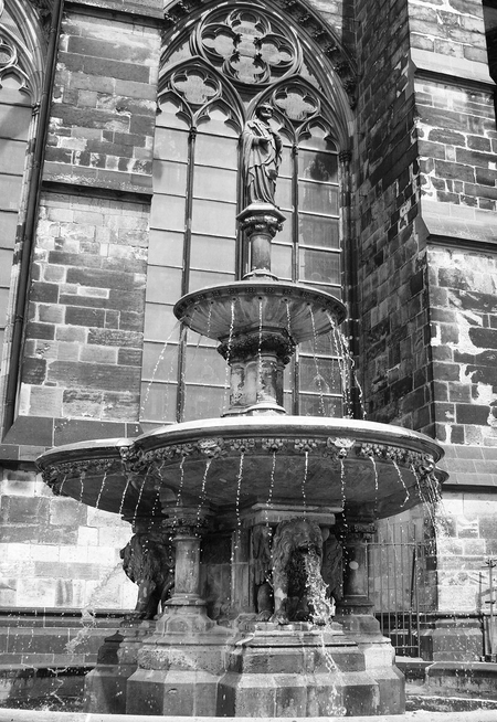 «Вначале фонтан был установлен возле восточной части собора. Он простоял без малого сто лет, пока в 1969 году его не перенесли на новое место, а в 1999 году совсем демонтировали. Затем лишь в 2010 году фонтан был установлен на Папской терассе, теперь уже на южной стороне Кёльнского собора». [8]