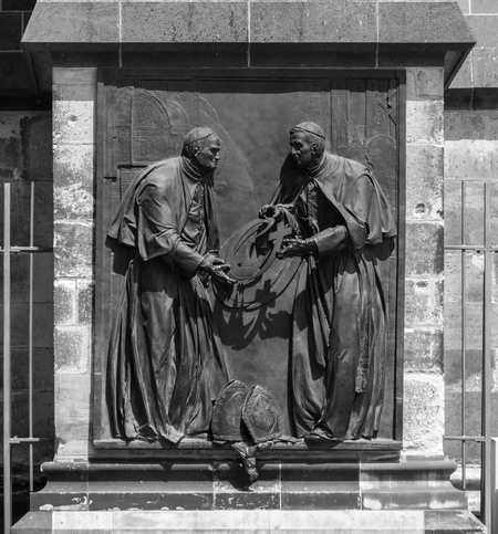 «Не так давно у стен южного фасада Кёльнского собора появился новый памятник, а точнее горельеф. На нем изображены реальные люди, хотя в жизни такой ситуации не было. Слева Папа Римский Иоанн Павел II, который передает символику Всемирного дня Католической молодежи в Кельне, Папе Бенедикту XVI». [9]