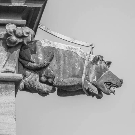 На втором фото изображена гаргулья, имеющая «форму свиньи, присевшей на задние лапы. Мужчина, в котором можно узнать еврея по конической шляпе на голове, сосет вымя свиньи». [10]