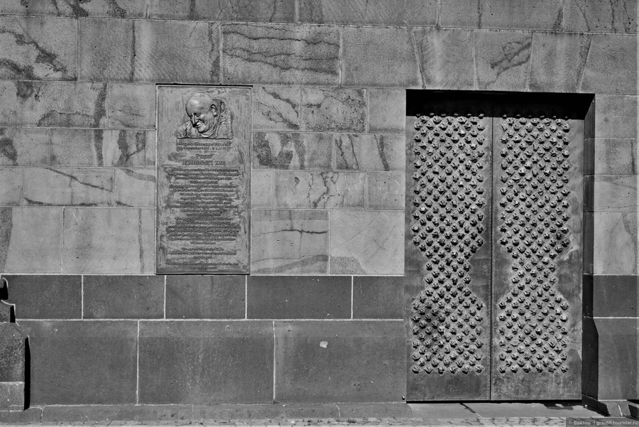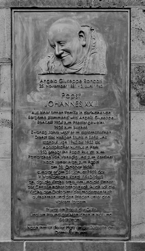 Можно увидеть небольшую железную дверь в стене собора, слева от которой находится мемориальная доска, рассказывающая о жизненном пути римского папы Иоанна XXIII с 1958 по 1963 год. Он был итальянцем по происхождению и до интронизации носил имя Анджело Джузеппе Ронкалли.