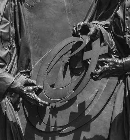 Внимательный взгляд позволяет разглядеть детали предмета, который передается из рук в руки. «Два треугольника показывают силуэт кафедрального собора и Вифлеемская звезда над ним, как символ того что в этом соборе находятся мощи Трех Волхвов, видевшие эту звезду». [9]