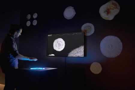 В аудио-визуальной инсталляции «Звук для грибов. Омаж неопределённости» посетители могли взаимодействовать с цифровой симуляцией роста мицелия с помощью сенсора отслеживания движения рук.