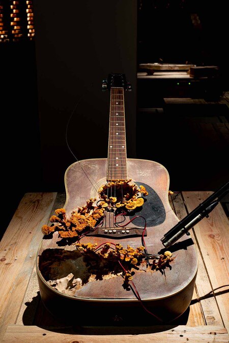 В её установках электрическая активность грибов транслируется в звук практически без обработки — чтобы сохранить «голос» мицелия и позволить зрителю услышать собственные ритмы гриба, его паузы, импульсы, моменты возбуждения и затишья.