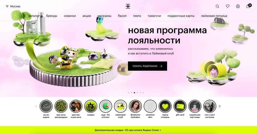 Нестандартным элементом айдентики выступает и фирменный маскот — эльф, позиционируемый как помощник, сопровождающий покупателя в мире бьюти-продуктов. Его присутствие создаёт устойчивую ассоциацию с сказочным пространством, где повседневные заботы временно уходят на второй план, а взаимодействие с брендом связывается с удовольствием, игрой и радостью. [2] В результате визуальная система в целом поддерживает образ проводника, а не авторитарного эксперта, что особенно созвучно с установками зумеров.