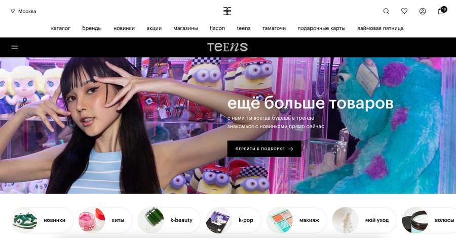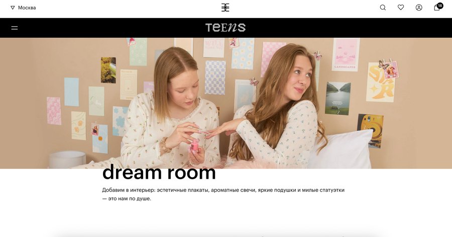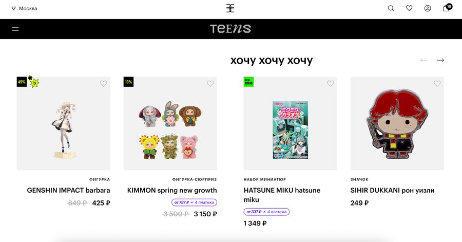 Отдельно выделен раздел «teens», в котором собраны отобранные товары специально для подростков. Он учитывает возрастные и культурные особенности младших зумеров, создаёт ощущение персонализированного подхода и поддерживает вовлечённость пользователей с раннего возраста.