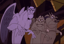 «Горбун из Нотр-Дама» (1996) Комичные советники Квазимодо (Виктор, Лаверн, Гюго). Их «оживление» — продукт воображения главного героя. Непосредственная привязка к собору Нотр-Дам. Показаны как неотъемлемая часть архитектуры, подчеркивая их изначальную функцию декоративного элемента. *Изображение: мультфильм «Горбун из Нотр-Дама» 1996 г.