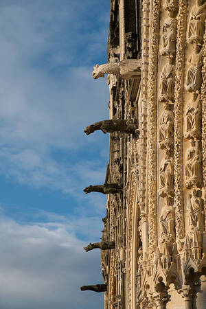 Амьенский собор считается эталоном «классической» французской готики XIII века и выделяется исключительной целостностью композиции и богатой скульптурной пластикой. Композиция собора отличается ясностью и математически выверенными пропорциями. Высота центрального нефа создает ощущение невероятного простора и устремленности ввысь. Фасады обильно украшены всевозможными статуями, барельефами, химерами, гаргульями и скульптурными медальонами-календарями с изображениями знаков Зодиака. Гаргульи являются неотъемлемой частью богатого и сложного готического декора, гармонично вписываясь в общую архитектурную композицию собора. Фантастические существа, в виде монстров или карикатурных персонажей придают фасаду динамичность и выразительность. Пугающий вид гаргульи служит защитой от злых духов и нечистых сил, оберегая священное пространство собора. Они выступают в роли стражей, которые как бы «отпугивают» зло от храма. *Изображение: Амьенский собор / 1230–1240 гг. / Амьен, Франция