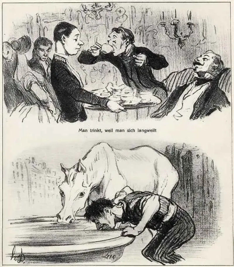 На карикатурах «Пьют от скуки. Пьют от жажды» и «Шеф пирует. У служащего обеденный перерыв» художник отражает контраст между богатыми и бедными людьми. В обеих ситуациях Оноре Домье изображает «элиту» общества высокомерными и даже надменными. На их лицах застыло презрение ко всему, что их окружает. Герои одеты «с иголочки», их образы идеальны, словно подбирались несколько часов. Несмотря на то, что они окружены роскошью и изобилием, эти люди будто потеряли вкус к жизни. В то время как «низший» слой населения карикатурист изображает изнеможденными и истощенными. Рабочий класс получает лишь минимум, а то и меньше, он вынужден постоянно работать и довольствоваться малым, не имея даже возможности отдохнуть, страдая от тяжелых условий жизни. С помощью антитезы мастер изображает социальную иерархию и неравенство во Франции XIX века.