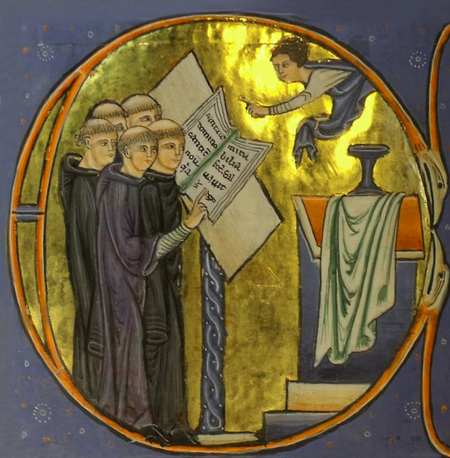 Монахи, поющие в инициале «K» из хоровой книги Бартоломео Госси да Гальярте (или его круга) 1476 г.